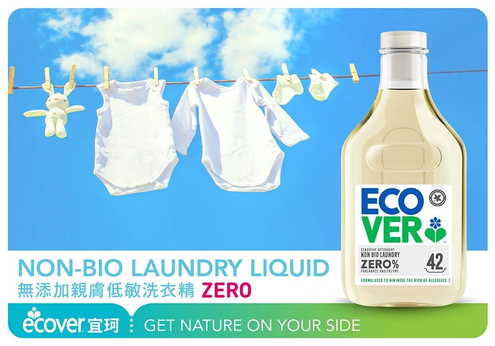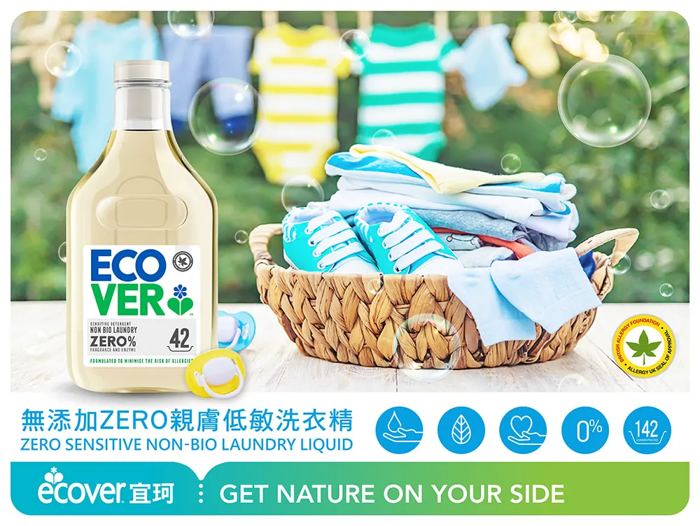宜珂 Ecover Zero產品系列,不添加任何香料、香精和色素,特別針對過敏性體質或是敏感性肌膚使用。Ecover 產品為自然、安全、健康、無毒不傷害人體及自然環境,同時通過低敏感測試。
